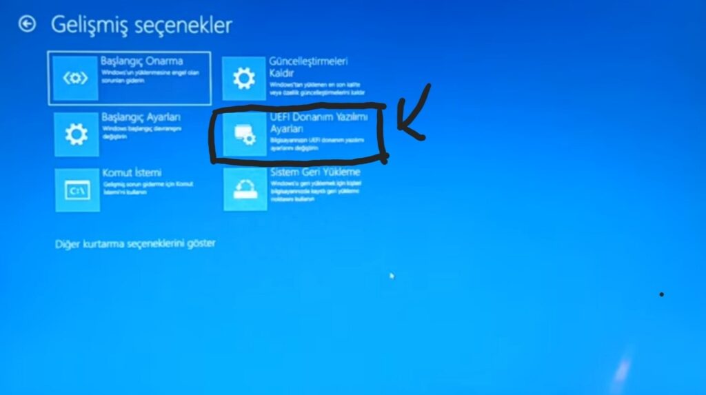 Gelen kısımdan UEFI Donanım Yazılımı Ayarları kısmına girip Yeniden Başlat tuşuna basın.